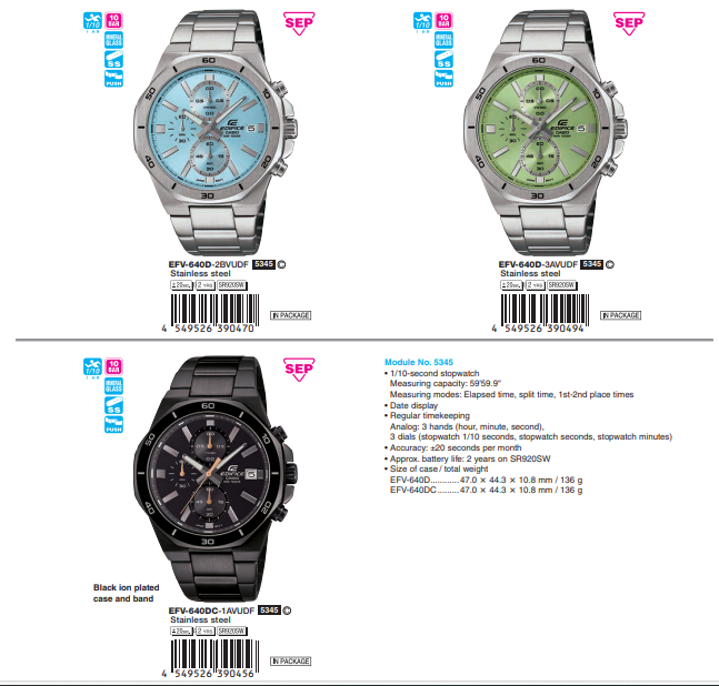 Giới thiệu đồng hồ bấm giờ đơn giản kiểu dáng thể thao chống vô nước 100 mét mặt trên của vỏ viền hình bát giác được hoàn thiện xước mờ sợi tóc, các cạnh được đánh bóng thành lớp tráng gương. Mặt số của mẫu EFV-640D sáng rực trên cổ tay của bạn. EFV-640DC có vỏ và dây đeo IP màu đen tạo nên phong cách lịch thiệp ấn tượng